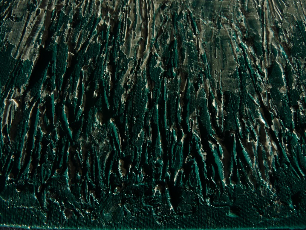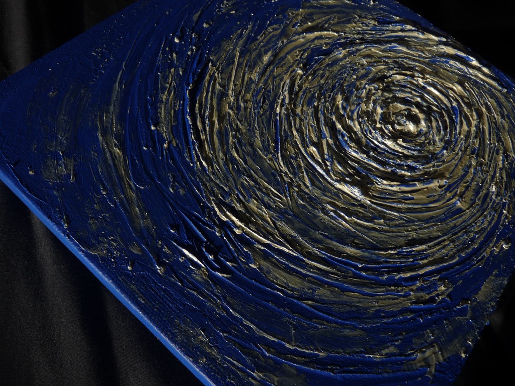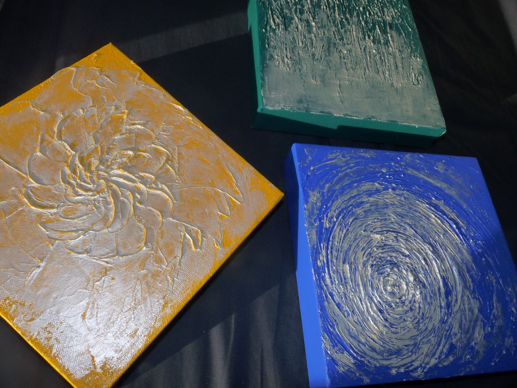 Se mets en place le processus de « création » et, les tableaux s’éloignent de l’idée initiale. La copie n’aura pas lieu puisque je prends de considérables initiatives : j’ajoute du relief à ma toile que je travaille de différentes manières suivant les couleurs. Le blanc ne recouvre pas l’ensemble de la surface de la toile. Avec un jeu de transparence, on discerne même des nuances dans les couleurs initiales.
