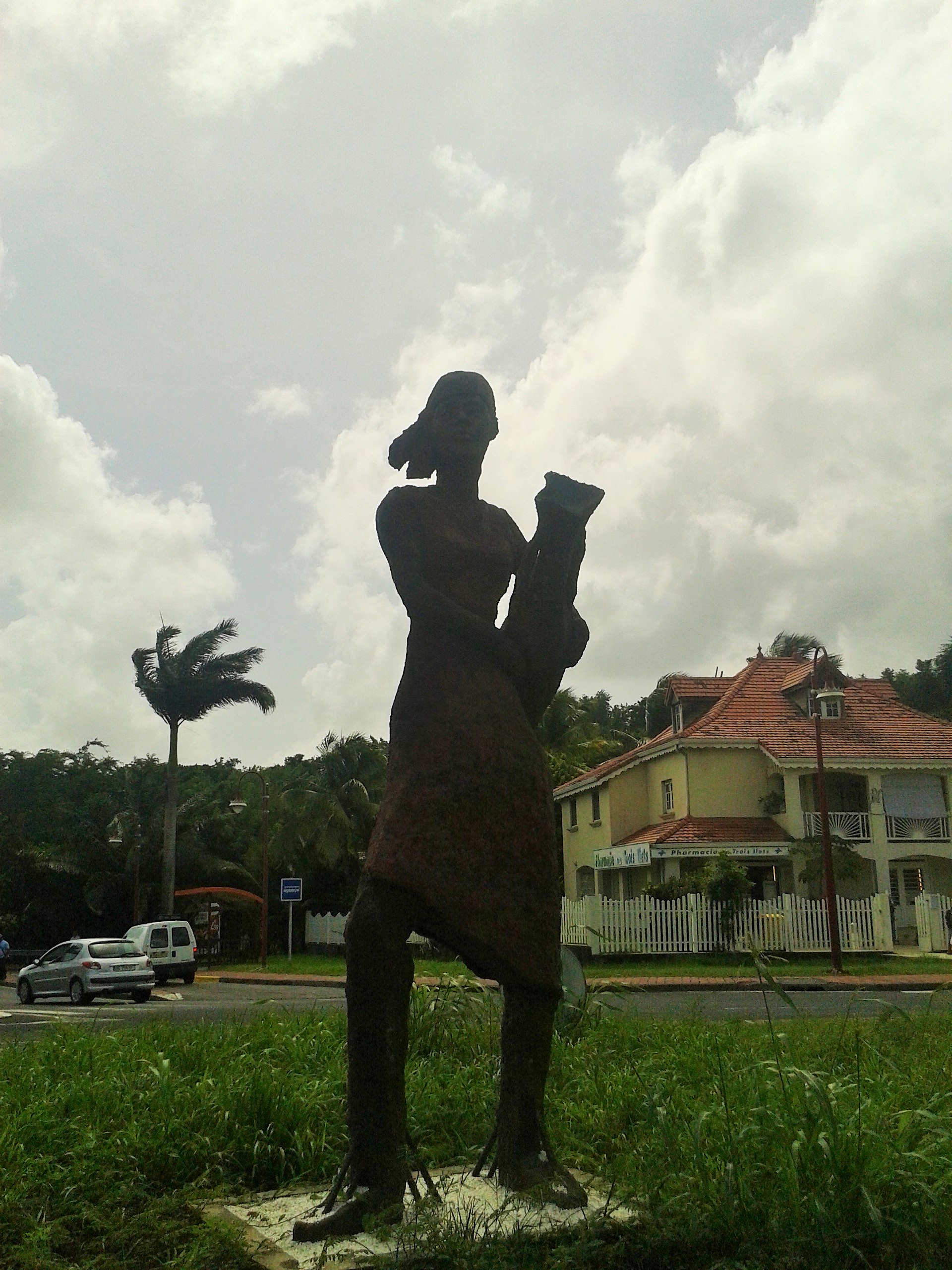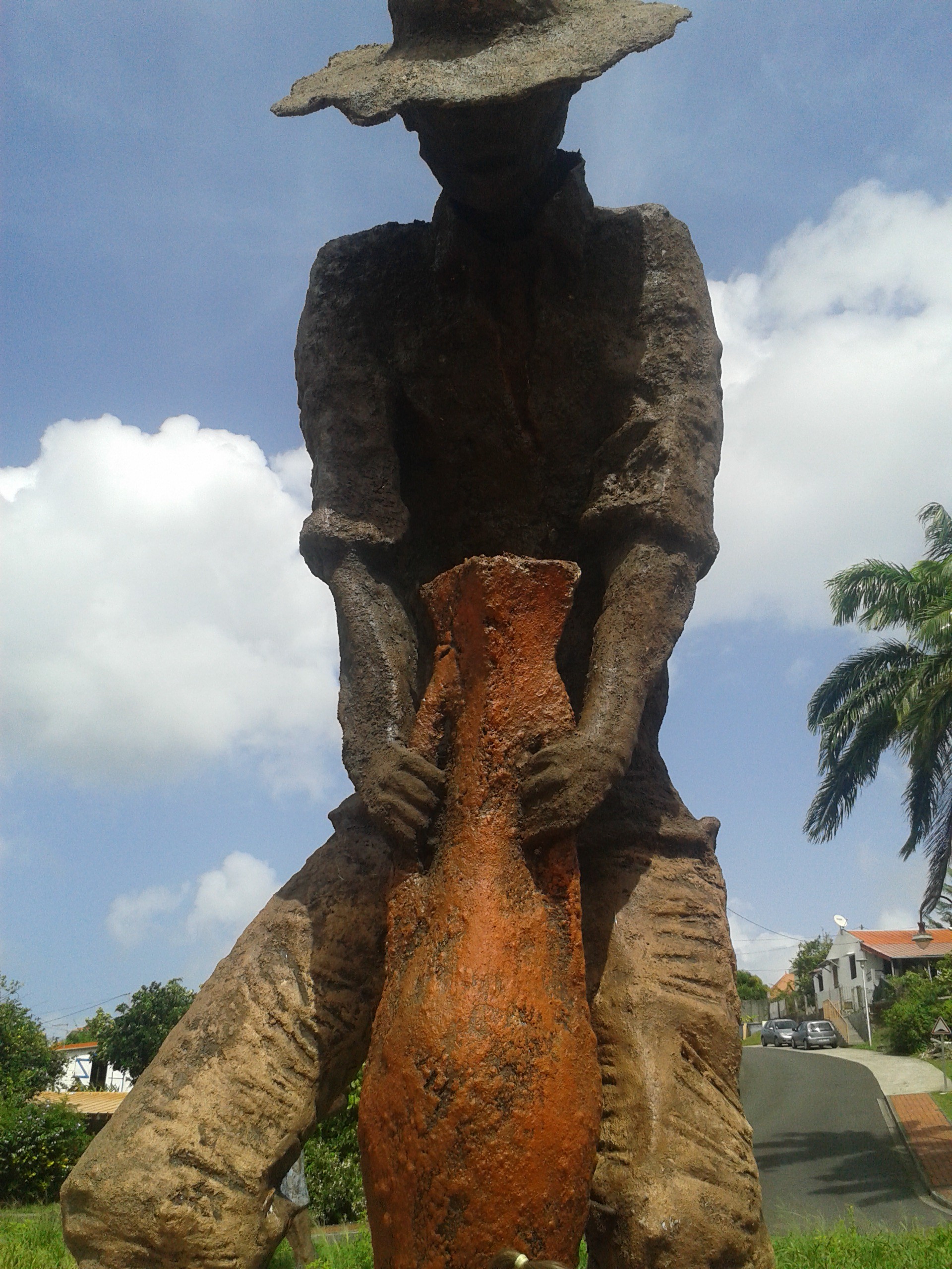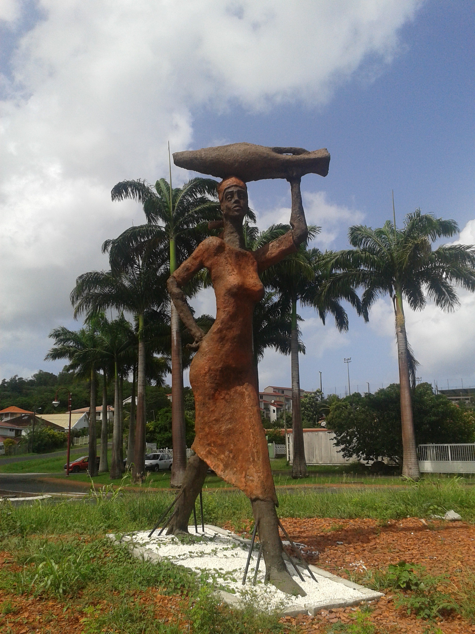 Actuellement le rond-point d’entrée dans la ville se pare de sculptures géantes à l’image des personnages des œuvres de Khokho. Une scène autour d’un puits qui ne demande qu’à prendre vie est l’œuvre de l’artiste martiniquais Jérôme Radigeois. Les géants de sable volcanique et résine sont bien en forme, mais l’ensemble ne me paraît pas encore achevé. Il manque une touche de finition pour compléter l’ensemble de l’installation : des espaces verts nickels et un éclairage adéquat -à mon avis.