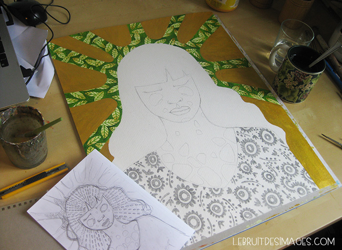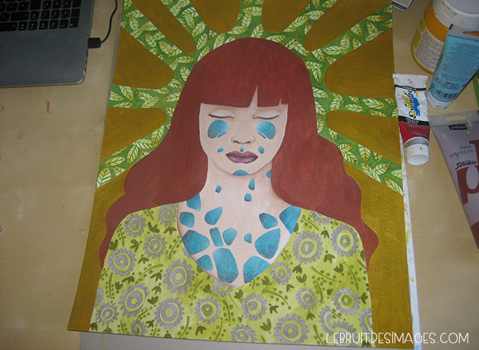 Ci-contre nous voyons un exemple de processus de création partagé sur son blog. C’est très instructif et il y a un aspect fascinant de voir se détailler le tableau. Pour avoir vu plusieurs processus de Gwenn, j’observe une manière de travailler qui est souvent la même : elle pose la composition du tableau et apporte les couleurs sur l’ensemble sans trop détailler. Puis, elle travaille en parallèle le sujet principal du tableau et le fond. Mais le sujet principal se précise plus rapidement et change moins radicalement que le fond, qui passe d’une couleur à l’autre et dont les motifs apparaissent et disparaissent, jusqu’à trouver ce qui lui convient.