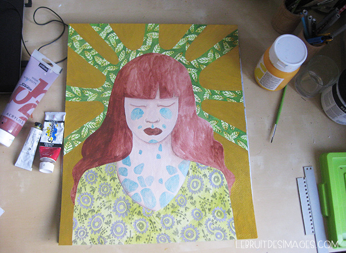 Ce que je trouve intéressant, c’est de voir sur les photos qu’elle partage un bout de palette, les tubes de peinture, un pinceau, un pot tout sale, un ordinateur. Ca ressemble à la vraie vie et ça en dit beaucoup sur la façon de travailler.