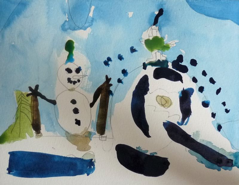 Sur cette partie, j’ai laissé les filles assez libres. Elles n’ont pas utilisées de modèle. Spontanément, le bonhomme de neige, les sapins et les montagnes sont apparus.